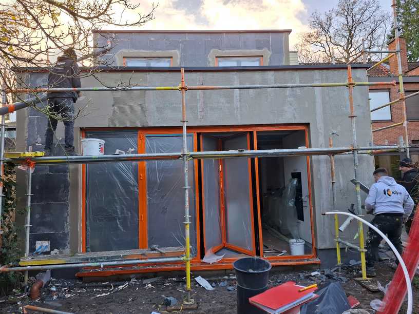 Aan de achterzijde wordt zowel op het gelijkvloers als de verdieping een uitbreiding gerealiseerd. De eigenaars voeren het merendeel van de werken zelf uit.